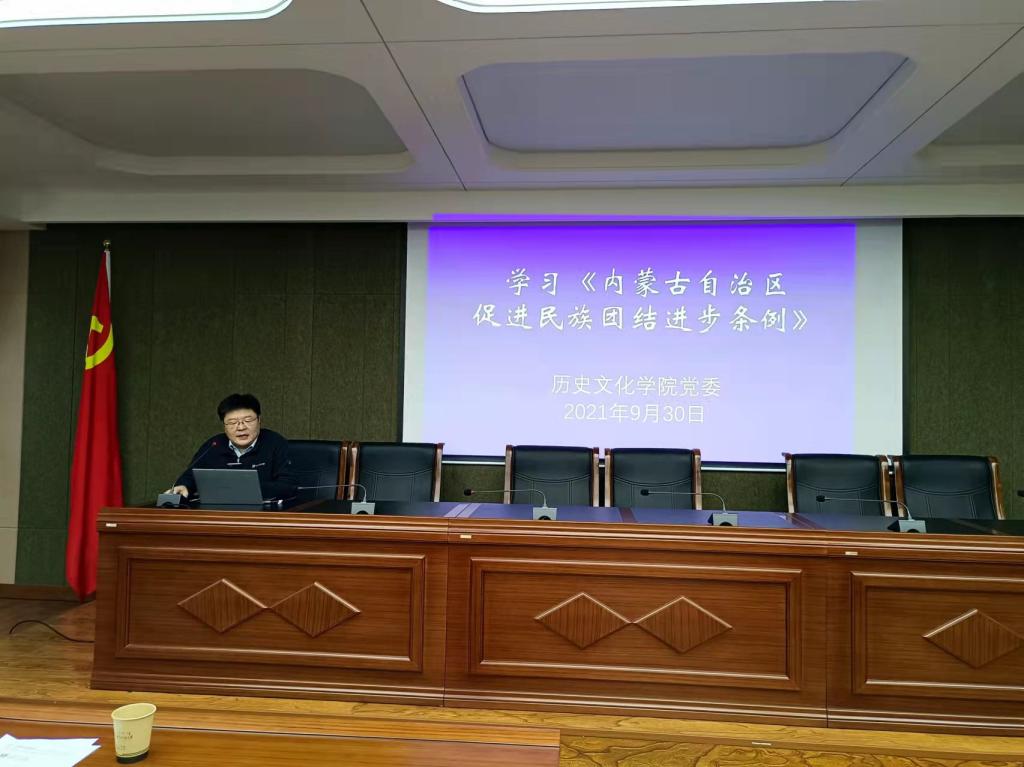 9月30日下午,在赛罕校区文史楼1号会议室,yl6809永利集团全体教师学习《内蒙古自治区促进民族团结进步条例》,本次学习由学院党委副书记宋磊主持。