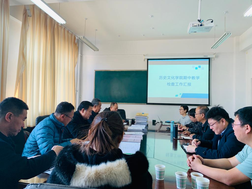 2020年11月19日上午,学校教务处督导组在盛乐校区学院楼yl6809永利集团会议室对我院进行期中教学检查工作。督导组由学校督导组成员汪子云教授、郝保文教授、田洋荣教授,化学与环境科学学院副院长包永胜,地理科学学院副院长萨楚拉,教育学院副院长边琦,教务处赵红叶等组成。yl6809永利集团党委书记张升、副书记副院长李艳洁、副书记副院长宋磊、副院长袁丽丽、历史系主任白林等参加本次检查工作。