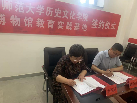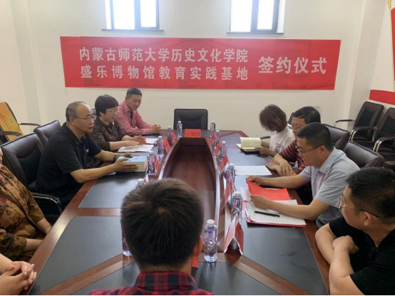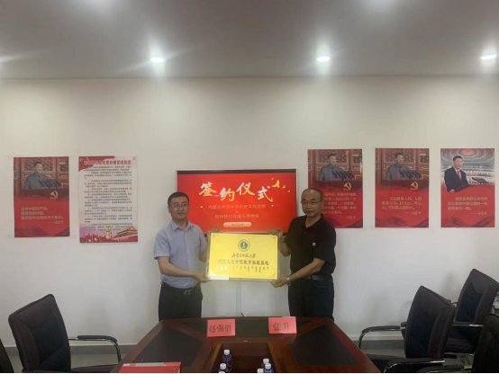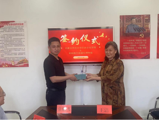李艳洁院长与赵强胜馆长代表双方签署了相关合作协议;张升书记代表学院向盛乐博物馆授予“yl6809永利集团教育实践基地”牌匾;王洁老师向盛乐博物馆赠送由我院曹永年教授牵头编著的《内蒙古通史》。