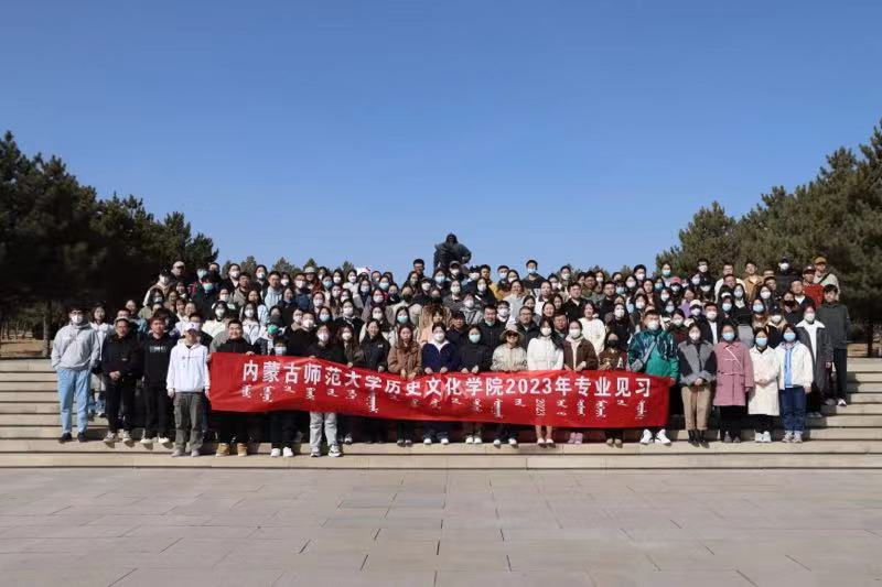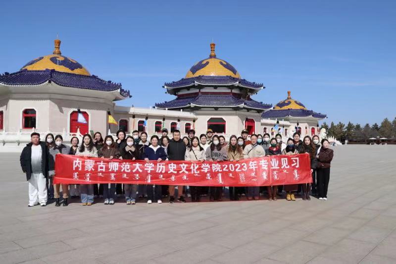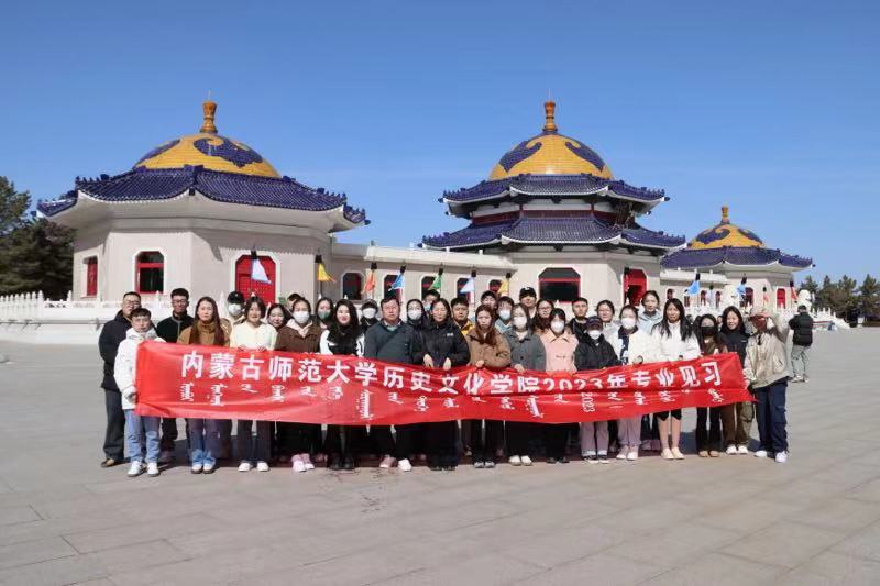 2023年2月28日,2019级历史学专业见习学生从盛乐校区出发,经过几小时路程,到达见习第一站:成吉思汗陵。首先映入眼帘的是宏伟、壮观的“气壮山河”入口门景。成吉思汗的跃马柱型雕像矗立门前,他手持苏鲁锭长枪,骑着久经沙场的战马,下方的三块“基石”分别是《蒙古秘史》《蒙古黄金史》《蒙古源流》。穿过门景就是壮观的“铁马金帐”群雕,它以恢宏的气势生动地再现了成吉思汗率蒙古大军出征的情景。北边蓝天绿草之间,三座蒙古包式的大殿肃然伫立,明黄的墙壁、朱红的门窗、辉煌夺目的金黄琉璃宝顶,使这座帝陵显得格外庄严。由正殿、寝宫、东殿、西殿、东过厅和西过厅六部分组成。正殿中央是成吉思汗汉白玉雕像,背后是成吉思汗建立的帝国时期疆域图。后殿供奉着成吉思汗及三位皇后的灵柩,寝宫酥油灯长年不熄。西殿内供奉着成吉思汗八白室,由吉劳(鞍辔)白室、胡日萨德格(弓箭)白室和宝日温都尔(圣奶桶)白室等组成。东殿里安放着一座灵包,灵包内供奉着成吉思汗幼子拖雷和夫人额希哈屯的灵柩。