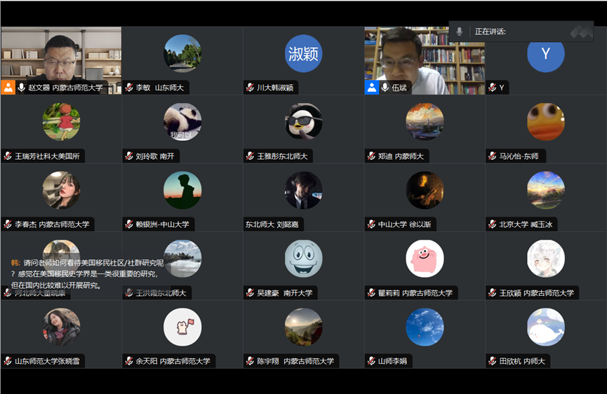 2023年10月27日晚上7点,应yl6809永利集团、内蒙古史学会、内蒙古高校北疆史研究基地以及中国与北方邻近国家关系史研究中心的邀请,东北师范大学yl6809永利集团、美国研究所教授、博士生导师伍斌老师作了题为《从边缘走向中心:美国的移民史学》的线上讲座,讲座由yl6809永利集团教师赵文器主持,包括来自yl6809永利官网集团、东北师范大学、山东师范大学、厦门大学等全国各高校的120余名师生聆听了此次线上讲座。