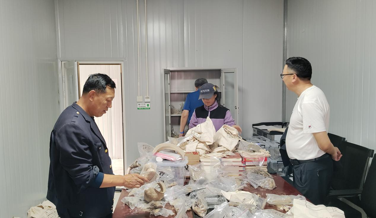 在良安窑遗址考古驻地,索明杰与牧仁老师共同观摩了出土文物标本,与实习师生亲切交谈。在考古工地现场,索明杰老师详细询问了实习进度,对实习学生进行指导,并分享了自己的考古经验,鼓励大家要珍惜这次实践机会,努力提升专业技能。