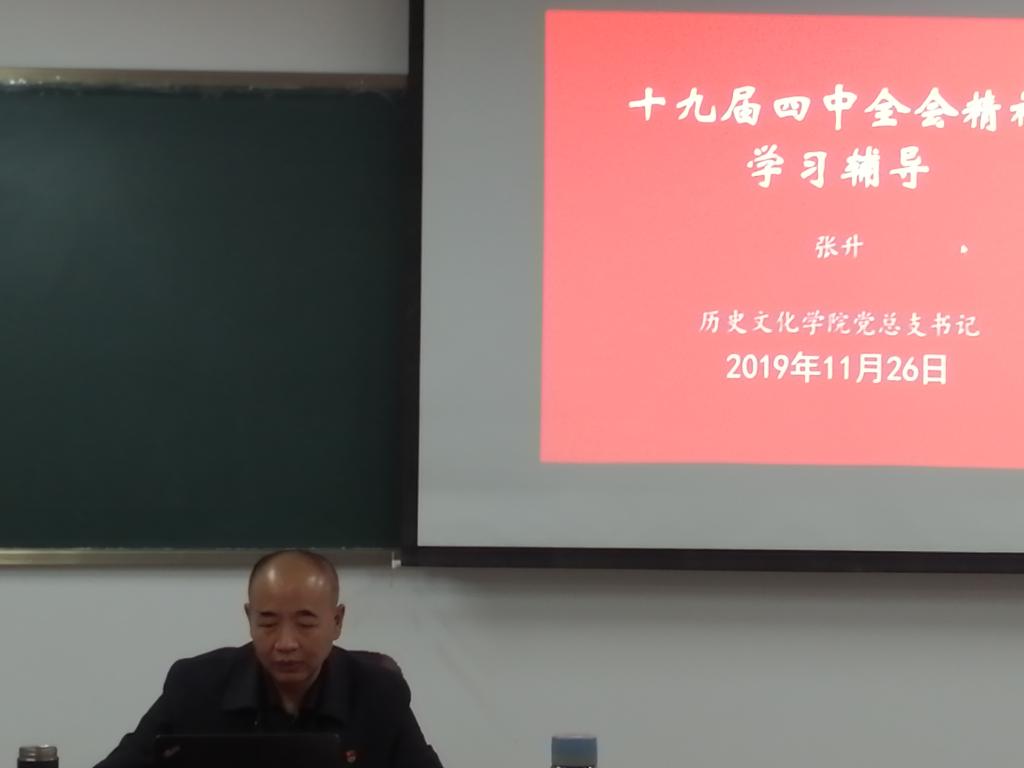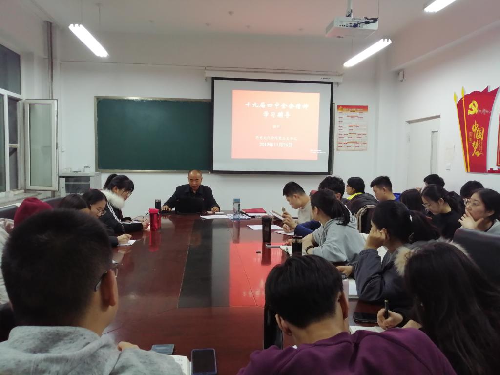 2019年11月26日晚7:30,yl6809永利集团学生党支部组织专题党课,邀请学院党总支书记张升老师为大家做“党的十九届四中全会精神学习辅导”,学院学生党支部全体党员参加学习辅导,辅导中,张升书记就《中国共产党第十九届中央委员会第四次全体会议公报》、《中共中央关于坚持和完善中国特色社会主义制度 推进国家治理体系和治理能力现代化若干重大问题的决定》和习近平总书记所做的《关于〈中共中央关于坚持和完善中国特色社会主义制度 推进国家治理体系和治理能力现代化若干重大问题的决定〉的说明》三份文件的重要意义、内容和学习要点进行了详细讲解。