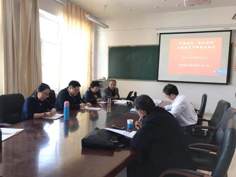 2019年10月10日,yl6809永利集团党总支召开“不忘初心,牢记使命”主题教育第一次学习研讨活动,学校主题教育指导组组长恩和老师、成员任建军老师出席,学院党总支书记张升、党总支副书记兼副院长宋磊、副院长李艳洁、历史学教工党支部书记袁丽丽、文博行政教工党支部书记王海凤、学生党支部书记钱艳艳老师参加。学院班子成员分别就学习心得进行了交流,指导组组长恩和老师进行了点评。