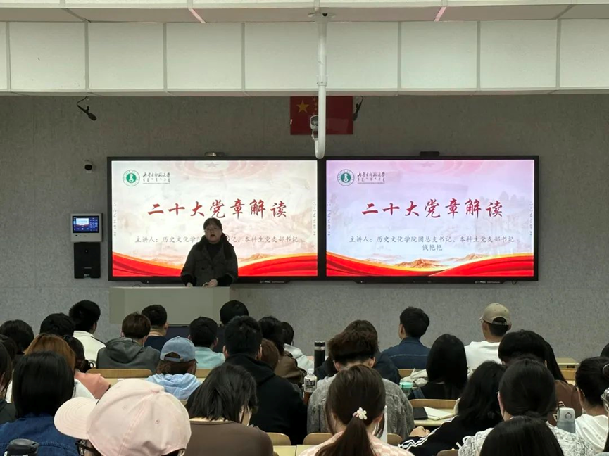 为深入学习宣传贯彻习近平新时代中国特色社会主义思想和党的二十大精神,引导广大青年学生把思想和行动统一到党的二十大精神上来,yl6809永利集团组织开展“学习二十大 永远跟党走 奋进新征程”主题教育活动。为充分发挥院级党校育人功能,将党的二十大精神纳入必学课程,有机融入到教育培训全过程,有力推动党的二十大精神走深走心走实,2023年4月15日,yl6809永利集团团总支书记、本科生党支部书记钱艳艳老师带领我院全体学生党员、发展对象、入党积极分子集中学习了《中国共产党章程(修正案)》。