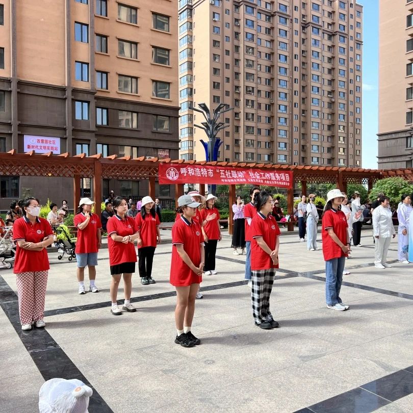 同学们在健身老师的带领下和社区内健身爱好者一起进行了八段锦健身活动。