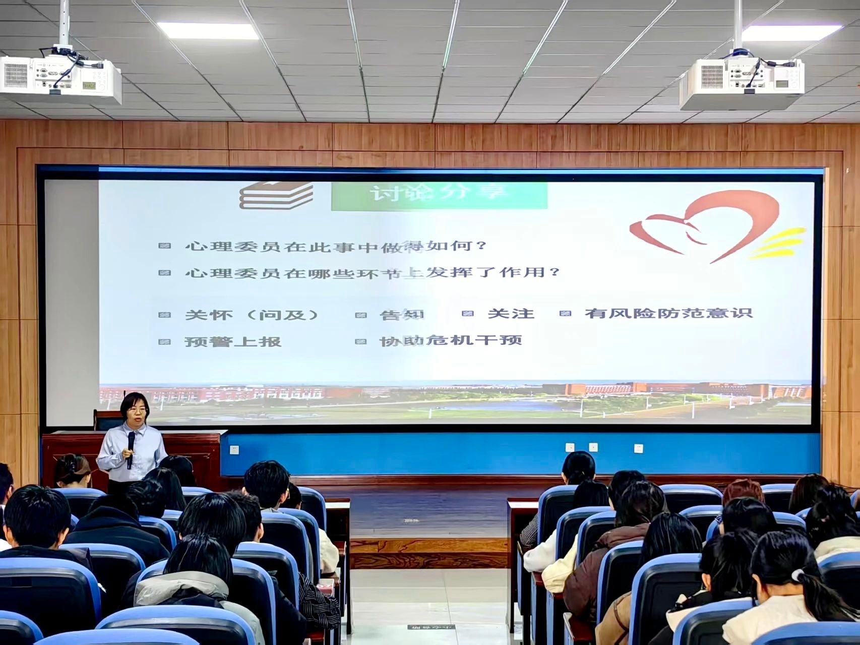 在高校校园中,心理委员与宿舍长在学生心理健康工作中扮演着关键角色,本次培训会提高了他们判断同学心理状况、关心身边同学的能力,加强了他们对工作重要性的认知,有助于营造积极健康、和谐友爱的校园氛围。未来,我院也将继续开展各类心理健康教育活动,助力全体学生的心理健康发展。