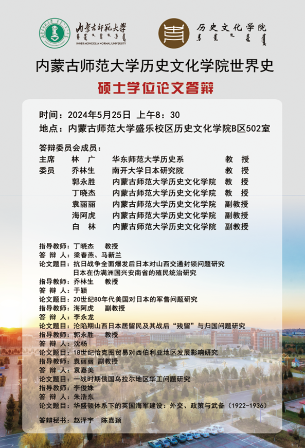 2024年5月25日上午,yl6809永利官网集团盛乐校区学院楼502会议室迎来了yl6809永利集团2021级世界史硕士学位论文答辩会。此次答辩会旨在检验研究生的学术研究水平和综合素质,并邀请了多位学术界权威人士担任评审,进一步保证答辩的高质量和公正性。