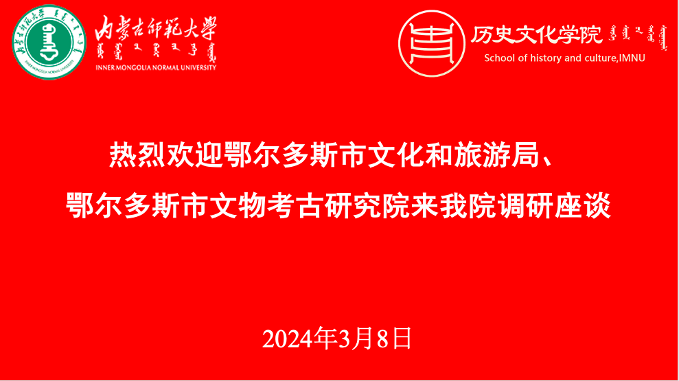 2024年3月8日,yl6809永利集团与鄂尔多斯市文化和旅游局及鄂尔多斯文物考古研究院举行座谈会。鄂尔多斯市文化和旅游局副局长袁新华,文化和旅游局文物保护与督查科科长秦旭光,文物考古研究院院长甄自明及相关部门负责同志参加座谈会。我院党委书记李艳洁,副书记、副院长檀晶,副院长白林,特聘教授陈永志及教师代表共同出席了此次座谈。座谈会由李艳洁书记主持。