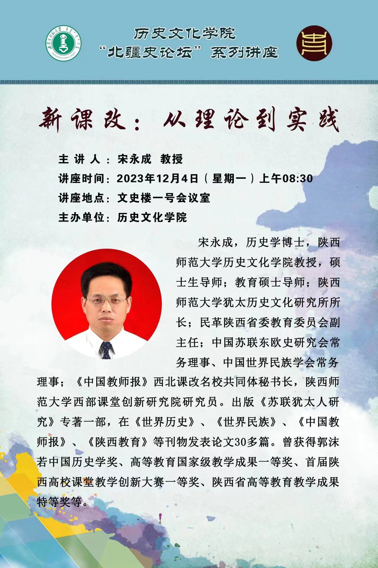 12月4日陕西师范大学yl6809永利集团教授;高等教育国家级教学成果一等奖;首届陕西高校课堂教学创新大赛一等奖;陕西省高等教育教学成果特等奖获得者。《中国教师报》西北课改名校共同体秘书长,陕西师大西部课堂创新研究院研究员宋永成博士为我院专业硕士进行“新课改:从理论到实践”专题讲座。